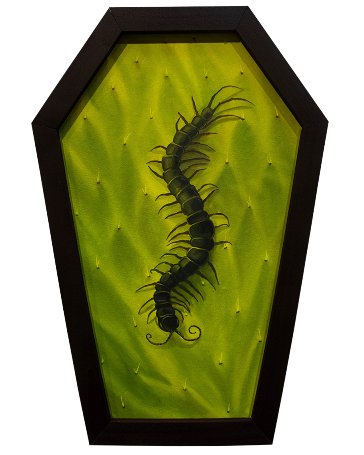 Oil on canvas, ink on paper, espinas, pomegranate seeds, soil, found objects, constructed frame triptych