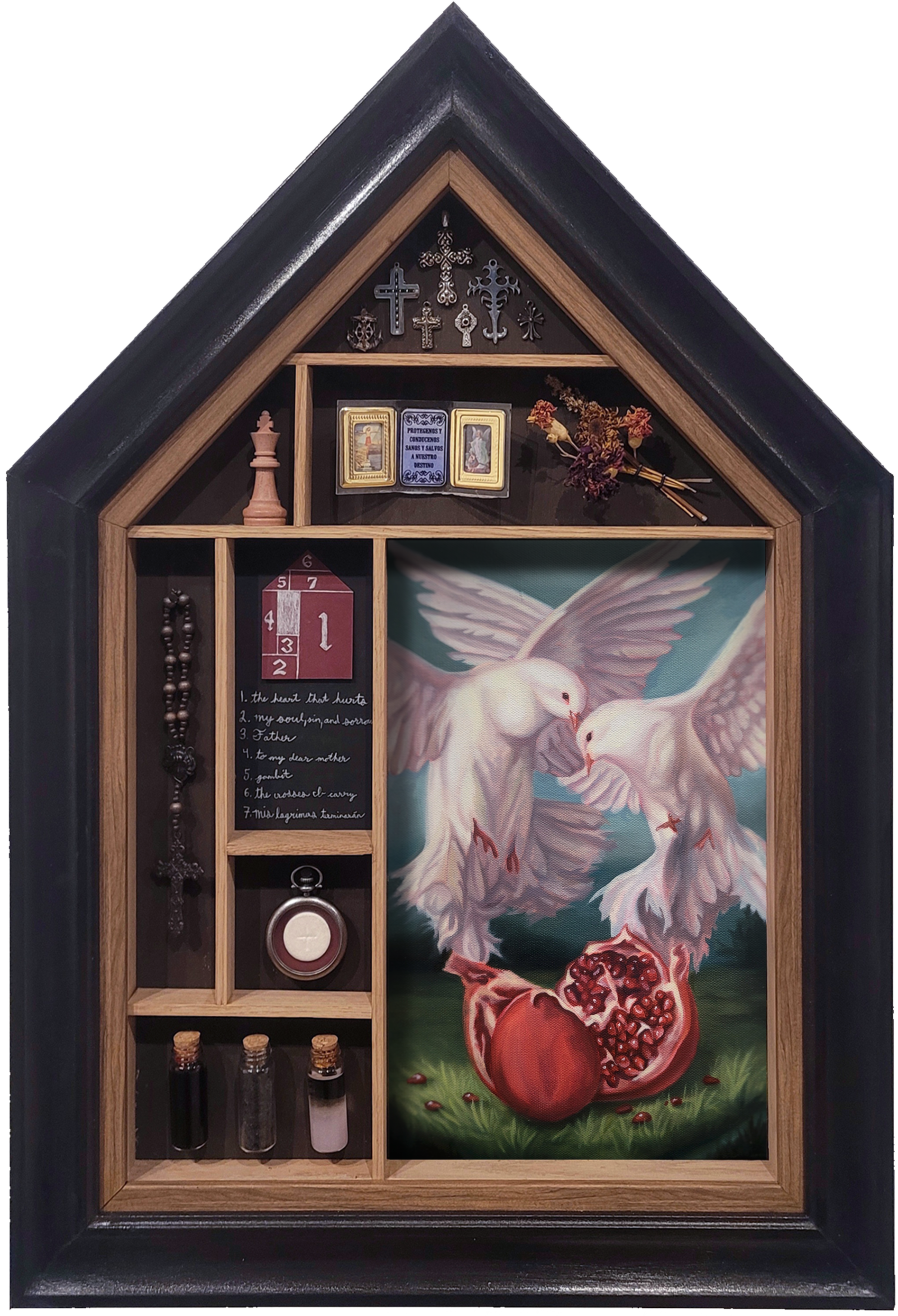 Oil on canvas, blood, ash, confessional water, rosary, dried flowers, communion wafer, crosses, constructed frame