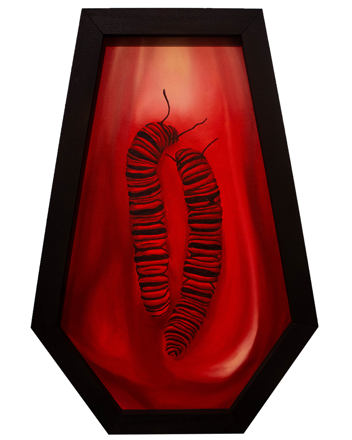 Oil on canvas, ink on paper, espinas, pomegranate seeds, soil, found objects, constructed frame triptych. 25.75” x 29.25” , 2025.